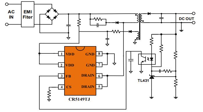 CR5149TJ副边电源芯片是一款高集成度、低待机功耗的 CCM+PFM 混合电流模式 PWM 控 制开关。CR5149TJ 轻载时会降低频率,最 低 频 率 22kHz 可避免音频噪声 。CR5149TJ提供了完整的保护功能,如OCP、OTP、VDD_OVP、UVLO 等。软启动功能可以减少系统启动时 MOSFET 的应力,前沿消隐时间简化了系统应用。通过频率抖动和软驱动电路的设计,降低开关噪声,简化了 EMI 设计。CR5149TJ 提供 DIP-8L的封装。